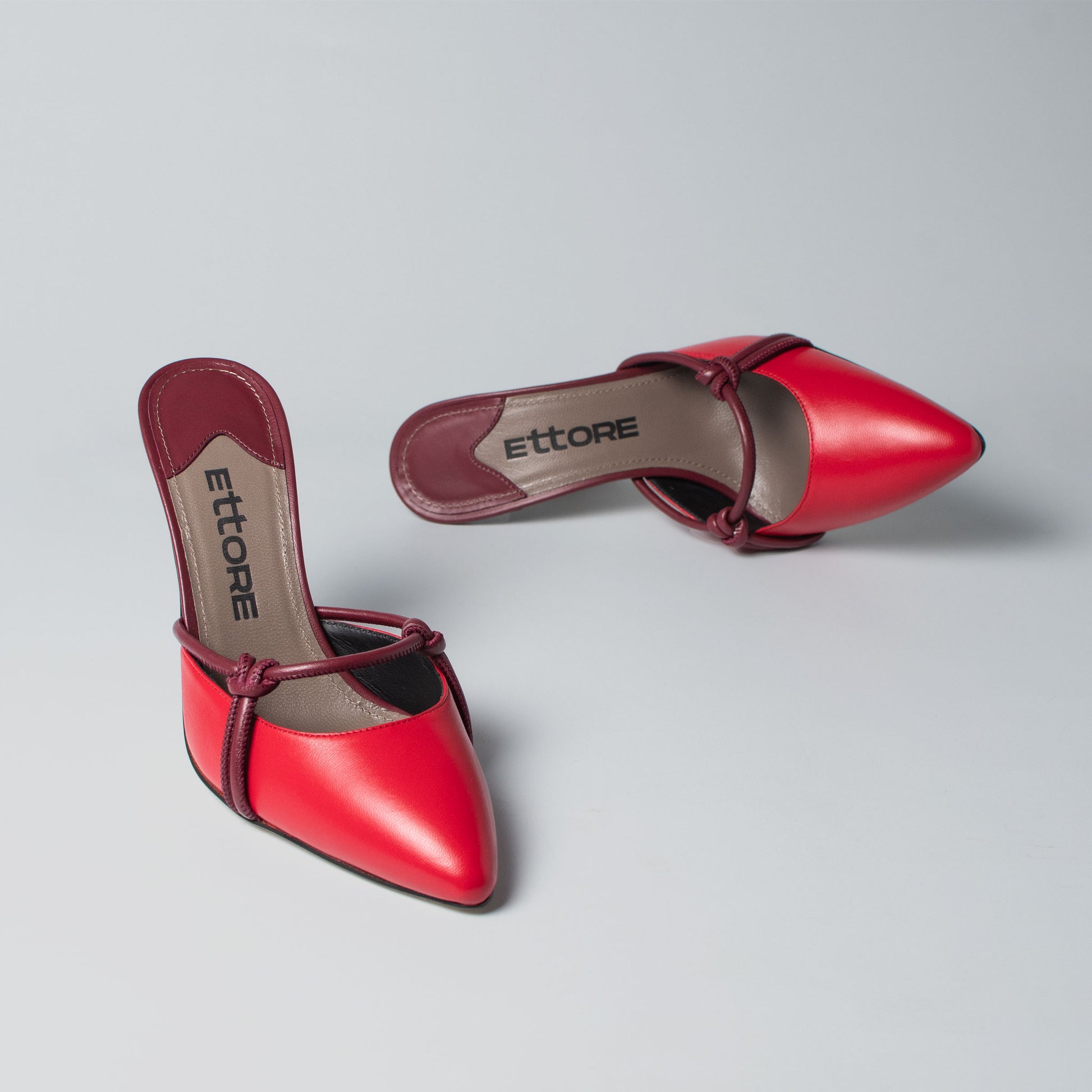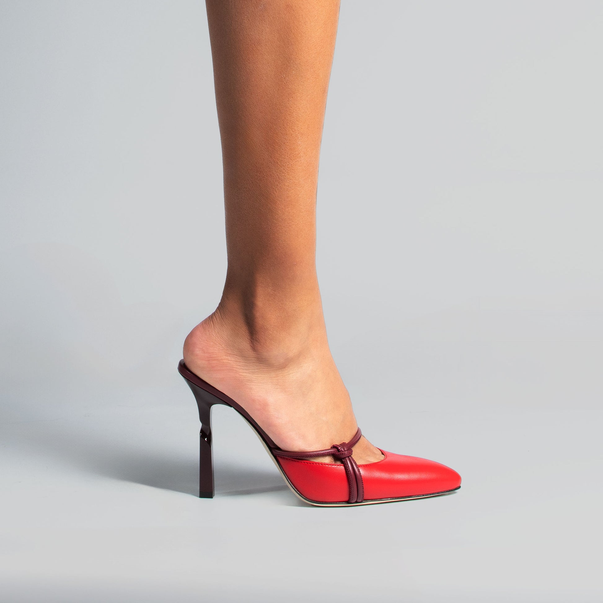 Almond toe mules in Chili calf leather with Malbec knotted gather straps. Finished with our signature twist stiletto heel.