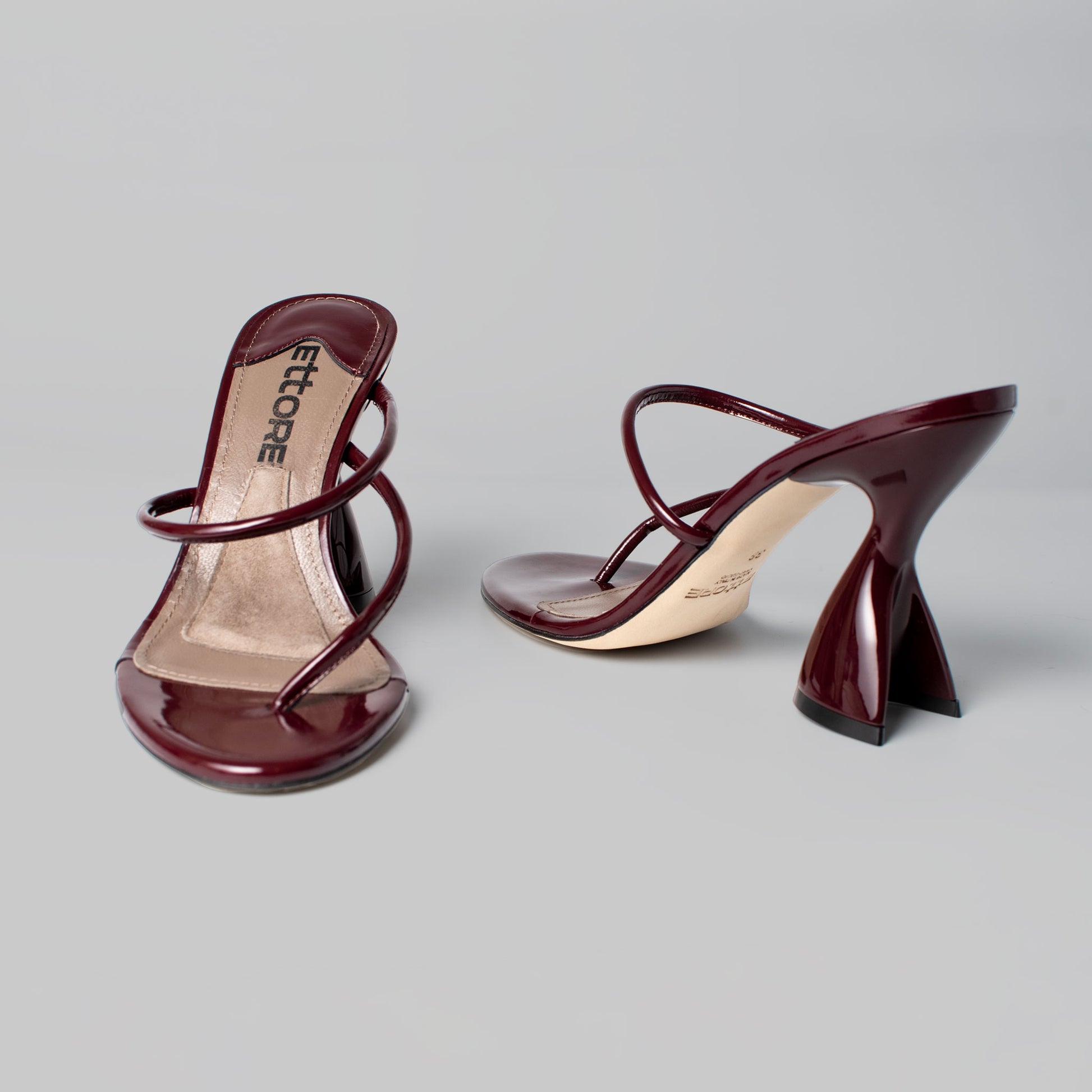 Malbec patent sandals featuring a toe stem strap that wraps around the arch with Finished with our signature 90mm curved heel.